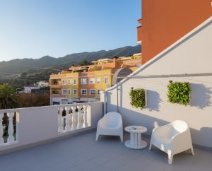 Terraza Chill Out en la azotea del edificio, además de mirador, tiene zona de tumbonas y una zona de relax con dos sillones blancos.